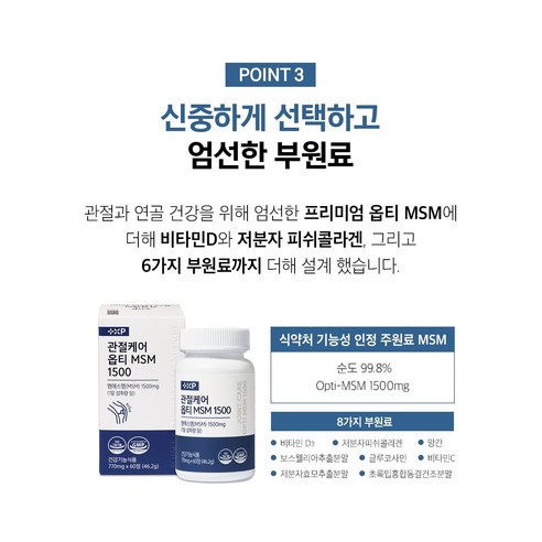 관절 건강을 유지하려면 MSM 섭취와 정기적인 관리가 큰 도움이 됩니다. MSM은 관절 염증 완화, 통증 감소, 연골 보호, 칼슘 흡수 도움, 운동 후 회복, 항산화 기능 강화 등 다양한 효과를 가지고 있습니다. 관절의 자연스러운 기능을 유지하려는 사람들에게 MSM은 믿을 수 있는 선택입니다.