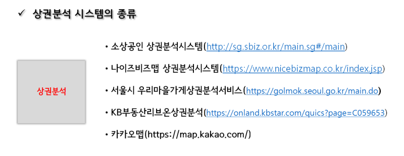 안녕하세요! 오늘은 상권분석에 대한 이야기를 가지고 왔습니다. 먼저 주제와 같은 상권을 분석할 수 있는 시스템으로 사이트를 소개하겠습니다. 우선 일반적으로 많이 사용되는 방법은 3가지가 있다고 하는데, 그 3가지 방법은 다음과 같습니다. 소상공인 분들은 한국시장진흥원 상권정보시스템, KT 인기상점, 서울시 우리마을상점 상권분석 서비스 이 세 가지를 많이 활용하시는 것 같습니다.
