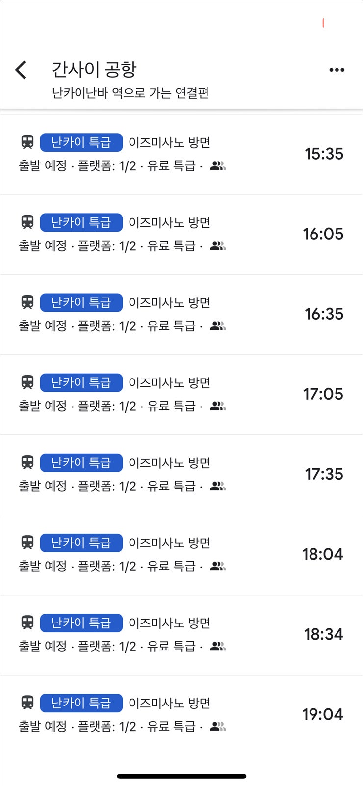 난바역으로 가실 경우 라피트(Rapi:t)선을 타시면 됩니다. 교토에 가는 사람들이 있나요? 신오사카역이나 덴노지로 가는 분들도 계십니다. 하루카 특급열차는 간사이 공항과 교토 간 이동에 편리합니다. 교토역까지 1시간 30분.