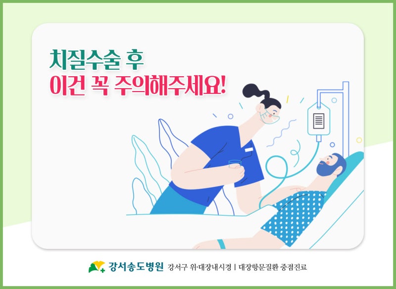 회복 기간은 치질의 중증도와 수술 유형에 따라 다릅니다. 치질이 심하지 않은 경우 경우에 따라 3~5일이면 나을 수 있지만, 2주 정도면 정상적인 생활로 복귀하기 어렵다고 합니다. 일상으로 돌아갈 때마다 수술을 하면 배변 시 통증이 일주일 정도 지속됩니다. 이때 통증에 대한 두려움이 변비로 이어지는 경우가 많지만, 변비는 또 다른 통증을 유발할 수 있기 때문에 수술 통증에 대한 걱정 없이 꾸준한 배변활동을 권해드립니다.
